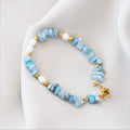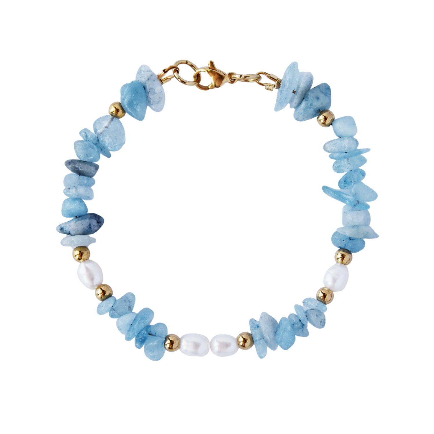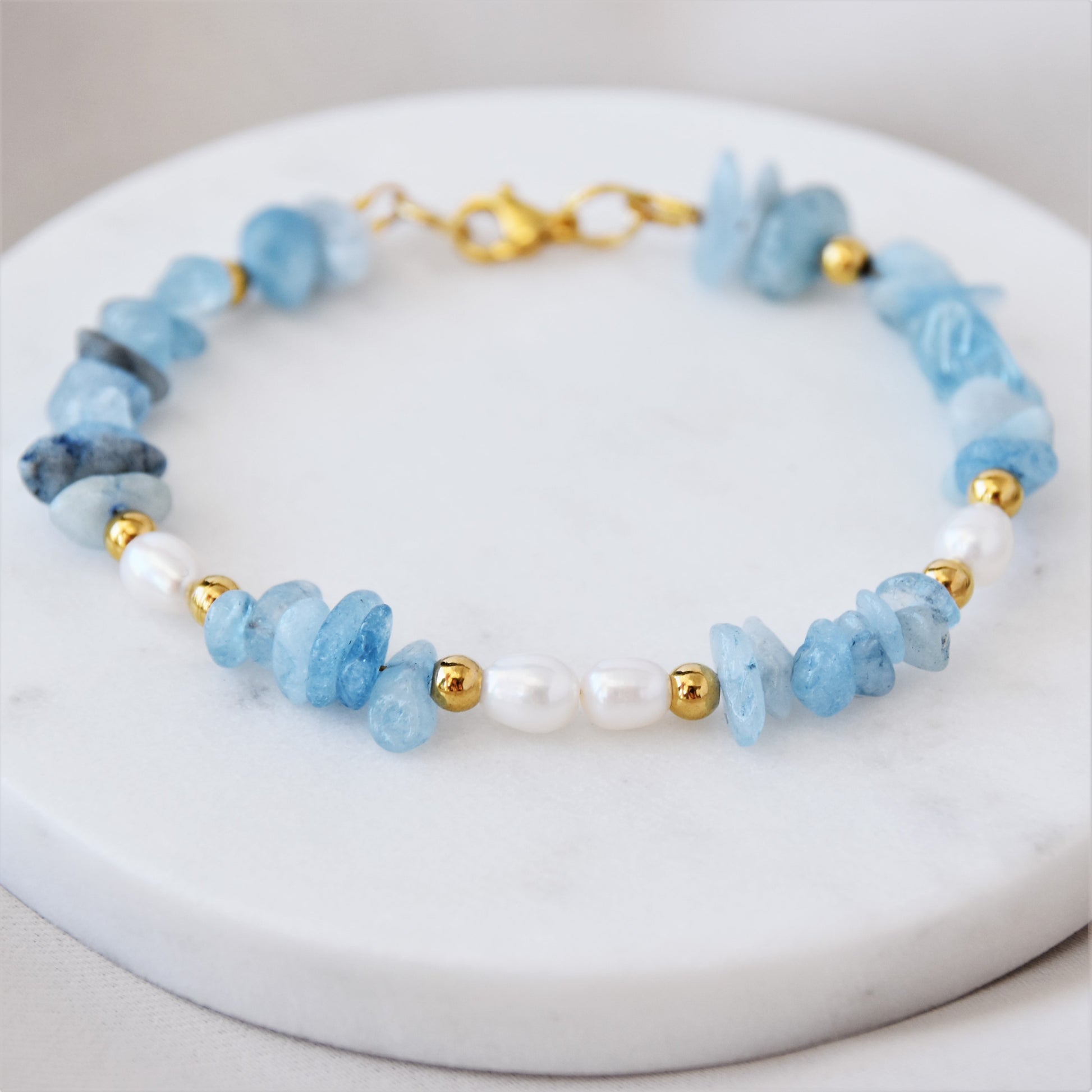 This freshwater pearls & aquamarine bracelet is a breathtaking piece of jewelry. Its classic design make it a timeless addition to any jewellery collection. The lustrous freshwater pearls and light blue aquamarine add a unique touch of sophistication.